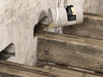 双组分环氧树脂流体胶粘剂用于结构用途,通过注射施涂到孔和凹槽中,但前提是凹槽要妥善密封。非常适用于利用新梁和现有梁将弯曲的木材连接件绑扎(Turrini-Piazza 方法)到木-混凝土复合楼板中的工艺;木材和金属之间的间隙约为 2 mm 或以上。插入金属板或杆后渗滤到凹槽中的垂直孔中。
